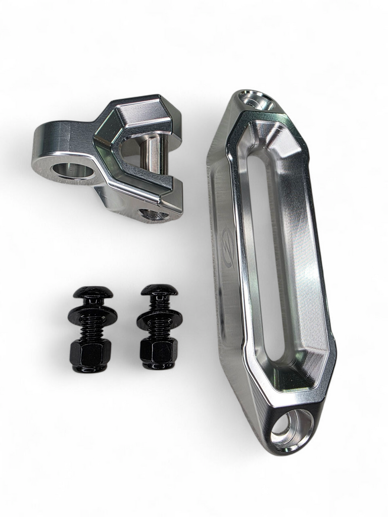 The Elektric Offroad Designs Winch Fairlead and Hook fits all standard UTV winch bumpers. The heavy duty billet aluminum fairlead is designed for synthetic rope winches and includes a tow hook to handle any recovery situation you may encounter. The combo hook & fairlead features a simple bolt-on installation with supplied hardware.